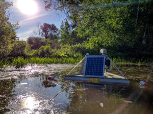 Pond Station is a modular platform for monitoring the hidden activity of a freshwater pond. It has been transmitting since May 2015 when it was commissioned as a long-term sculpture at Wave Farm in Acra, NY. It floats on the water’s surface, broadcasting underwater sounds through a live radio link. It operates from dawn to evening every day, using solar-charged internal batteries. Pond Station’s receiver is located in the Wave Farm radio studio where resident artists and broadcasters on WGXC FM can experience the pond’s natural sounds or remix and interpret them. International audiences are invited to do the same via the Locus Sonus Sound Map.