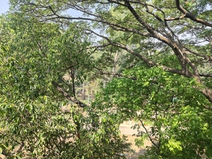 Tree-height vantage point overlooking a army cantonment area called Harris Barracks in central Bengaluru. Sounds might include birds, crickets, street dogs, devotional music (on loudspeakers), fajr from two nearby mosques, light traffic and commuter train sounds.