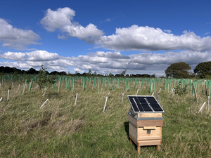 15 ha of new tree planting are added to 4 ha of existing tree cover, with the remaining space a mix of scrubland, open spaces, and unplanted land adjacent to the woodland, from which seedlings are expected to establish. This will transform grassland into a mosaic of habitats, increasing biodiversity. A long term solar powered stream installed by the Soundcamp Cooperative with Alex de Little in July 2025 aims to give attention to sounds of the area and the woodland as it grows. Projected listening period: 10+ years. |