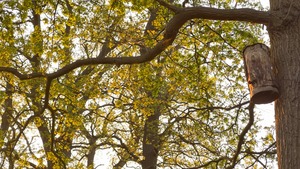 A pre-maternity roost of Leisler's bats Nyctalus leisleri where female bats getting ready to give birth gather before moving to the main roost to give birth. The bats roost in a large bat box located in a copse of oak trees in a corner of ancient parkland associated with a historic house now owned by the National Trust.Microphones located close to the box entrance to detect the audible sound of roost 36kHz.