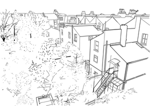 Back yard in South London. Eco social sounds including aircraft, birds, weather, construction, people in surrounding houses and gardens.